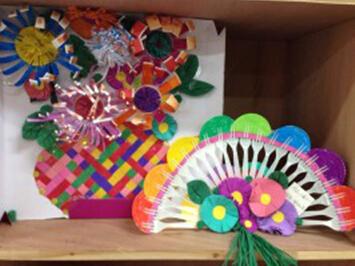 中三班洋洋老師利用廢舊材料紙杯、叉子等做出了精美的扇子和花籃。