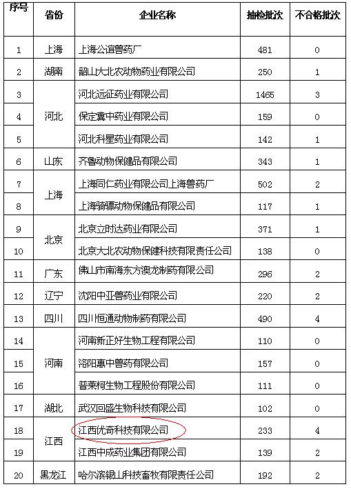 據(jù)悉,這些企業(yè)近年被抽檢次數(shù)超過百次,抽檢合格率超過98%,即使抽檢不合格,也少有因產(chǎn)品質(zhì)量的問題。產(chǎn)品不確認(rèn)率低于4%。這些企業(yè)為畜牧業(yè)的保駕護(hù)航提供了不可磨滅的貢獻(xiàn)。今后這20家企業(yè)均由中國醫(yī)藥品檢查所進(jìn)行抽檢,其他任務(wù)承擔(dān)單位只對其產(chǎn)品進(jìn)行監(jiān)督檢查,不對其產(chǎn)品進(jìn)行抽樣檢驗。