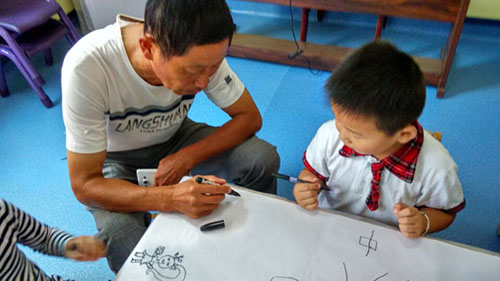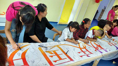 小朋友和老師家長們共同在畫紙上揮動手中的畫筆。看,小朋友們個個認真、專心畫畫的模樣,多可愛啊!