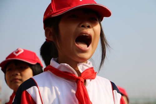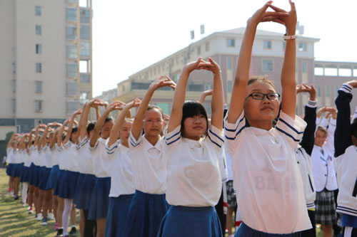 全場學(xué)生進(jìn)行做出“奮發(fā)向上”的動作