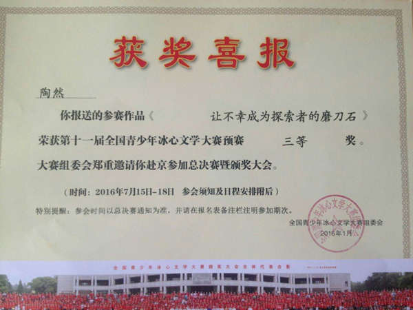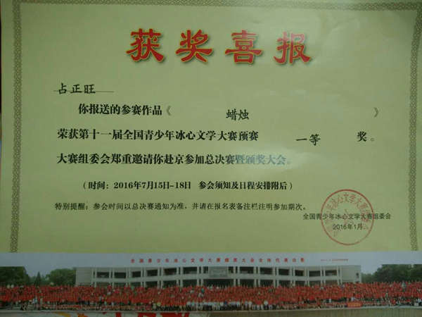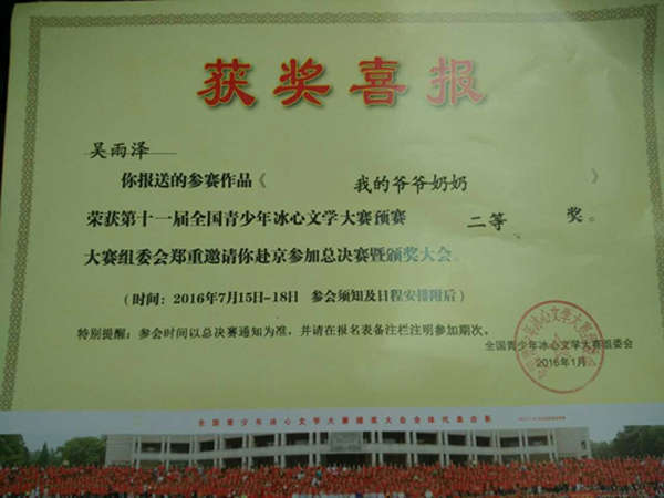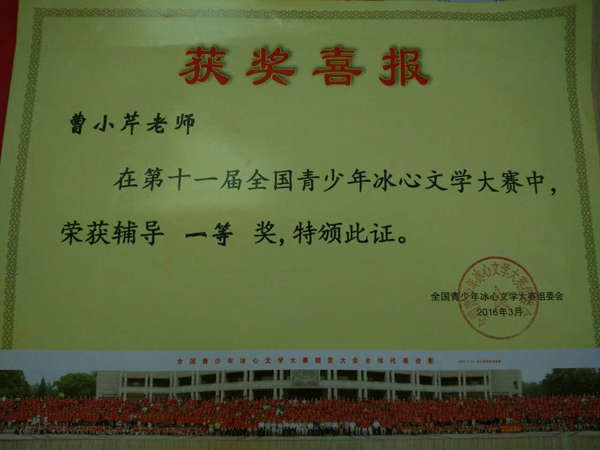 在第十一屆全國青少年冰心文學大賽和第十二屆“為學杯”全國中小學創新作文大賽中,英邁培訓學校碩果累累。其中在第十一屆全國青少年冰心文學大賽中,占正旺、胡晶秋兩位同學榮獲預賽一等獎,吳雨澤同學榮獲預賽二等獎,熊智、陶然兩位同學榮獲預賽三等獎。在第十二屆“為學杯”全國中小學創新作文大賽中,鄒旸同學榮獲小學組一等獎,陶然同學榮獲小學組二等獎,張莉同學榮獲初中組三等獎。同時,學校的曹小芹老師在第十一屆全國青少年冰心文學大賽中,榮獲輔導一等獎。