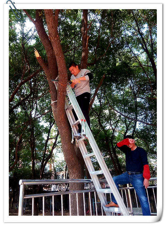張主任站在梯子上鋸樹