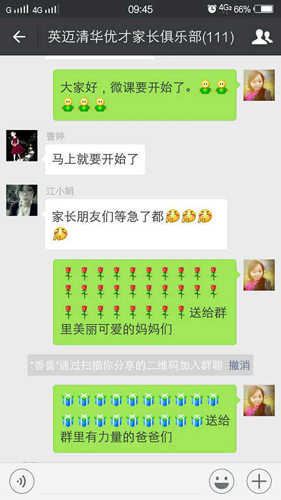 為了豐富教學內容,創新教學模式,加大家長的參與度,南昌英邁優才培訓學校采用網上微課堂的形式開展家庭教育活動,該活動利用微信平臺,建立家長微信群,通過發送語音消息的形式,跟家長溝通家庭教育方面的問題,眾多家長紛紛參與,并給出高度評價。此次“空中微課堂”活動是南昌英邁優才培訓學校楊校長結合她平時的教學經驗進行的一次創新。