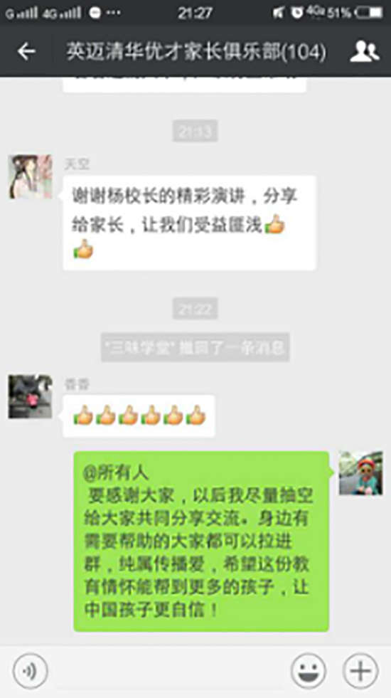 楊校長積極和微信群中的家長溝通交流