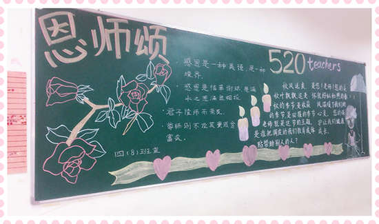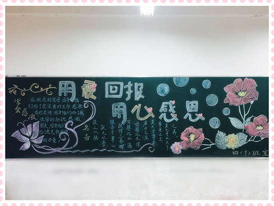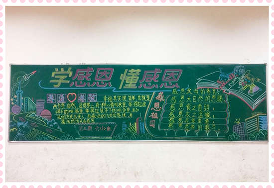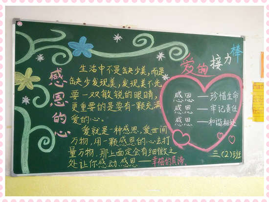 本期黑板報(bào)美觀靚麗,精彩紛呈,讓同學(xué)們通過參與,懂得了感恩的重要,懂得了怎樣去感恩別人,學(xué)會了對父母、學(xué)校、社會心懷感激之情,為校園文化增添了一道亮麗的風(fēng)景線。