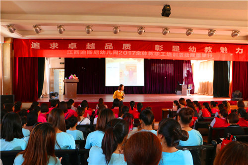 為了加強教師技能,加強教師間的溝通與交流,增進同事感情,增強團隊凝聚力,5月13日,江西迪斯尼·幼兒園2017年全體教師培訓活動在江西工商職業(yè)技術學院大禮堂順利舉行,迪斯尼幼兒園六個園所全體教職工近兩百人參加此次活動。