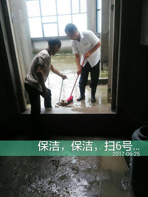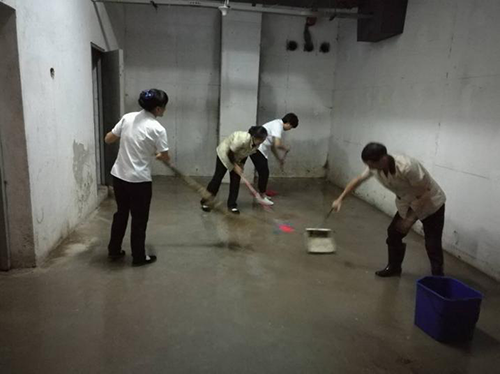 1、哪里需要到哪里,你看,保潔員、秩序員、客服員,還有品質部經理正在對積水進行清掃。