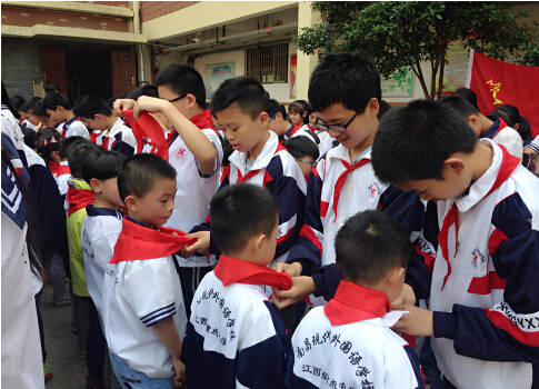 六年級(jí)隊(duì)員為新隊(duì)員佩戴紅領(lǐng)巾